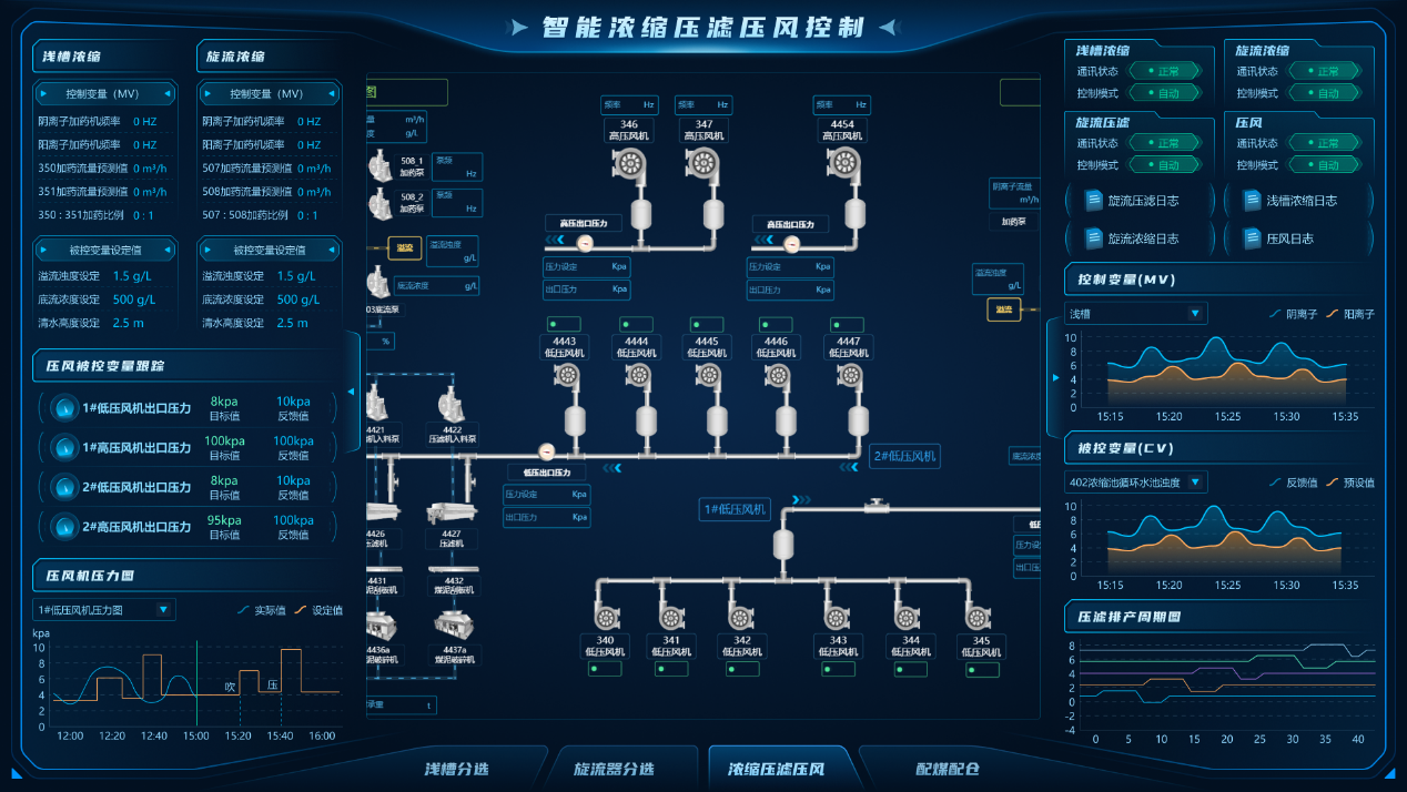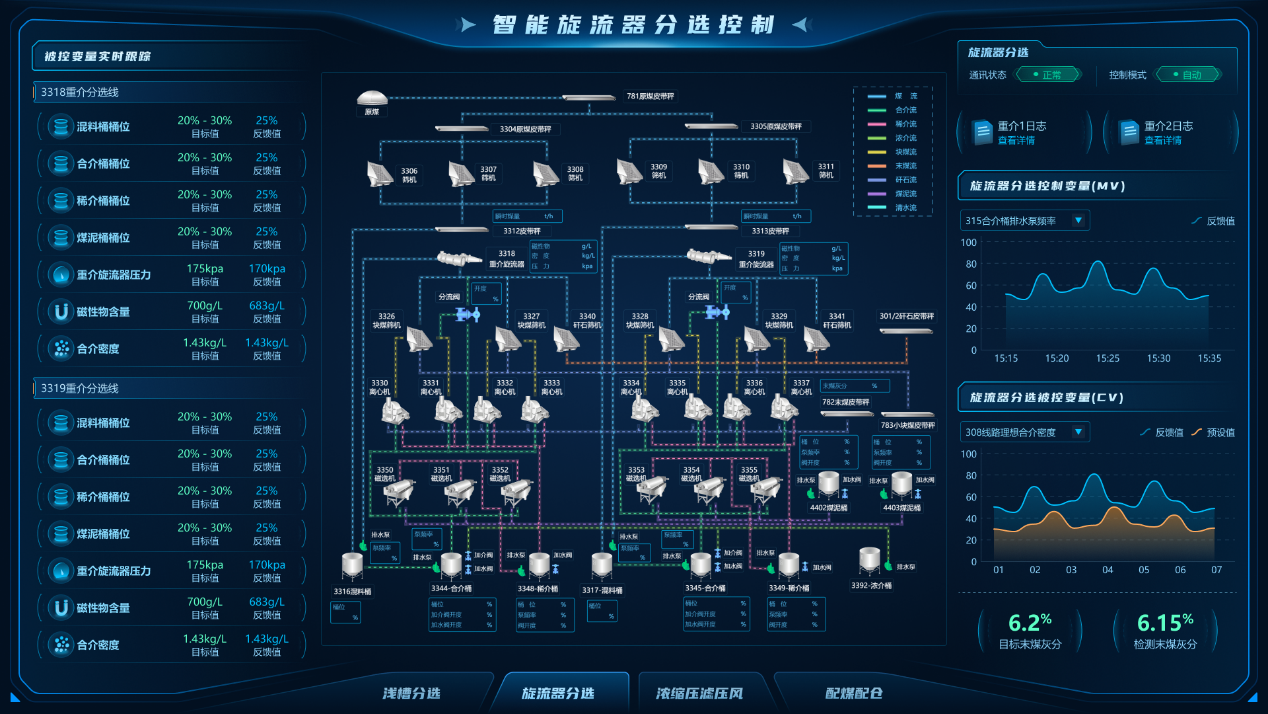 “數(shù)據(jù)-模型雙驅(qū)動(dòng)的選煤廠智能控制與決策系統(tǒng)的研究與應(yīng)用”項(xiàng)目研發(fā)了“數(shù)據(jù)-模型雙驅(qū)動(dòng)”的選煤廠控制系統(tǒng),融合模型預(yù)測(cè)控制(MPC)、無模型自適應(yīng)控制(MFAC)與多輸入多輸出預(yù)測(cè)模型控制,實(shí)現(xiàn)了重介分選、濃縮壓濾、精準(zhǔn)配煤等環(huán)節(jié)的毫秒級(jí)閉環(huán)控制。