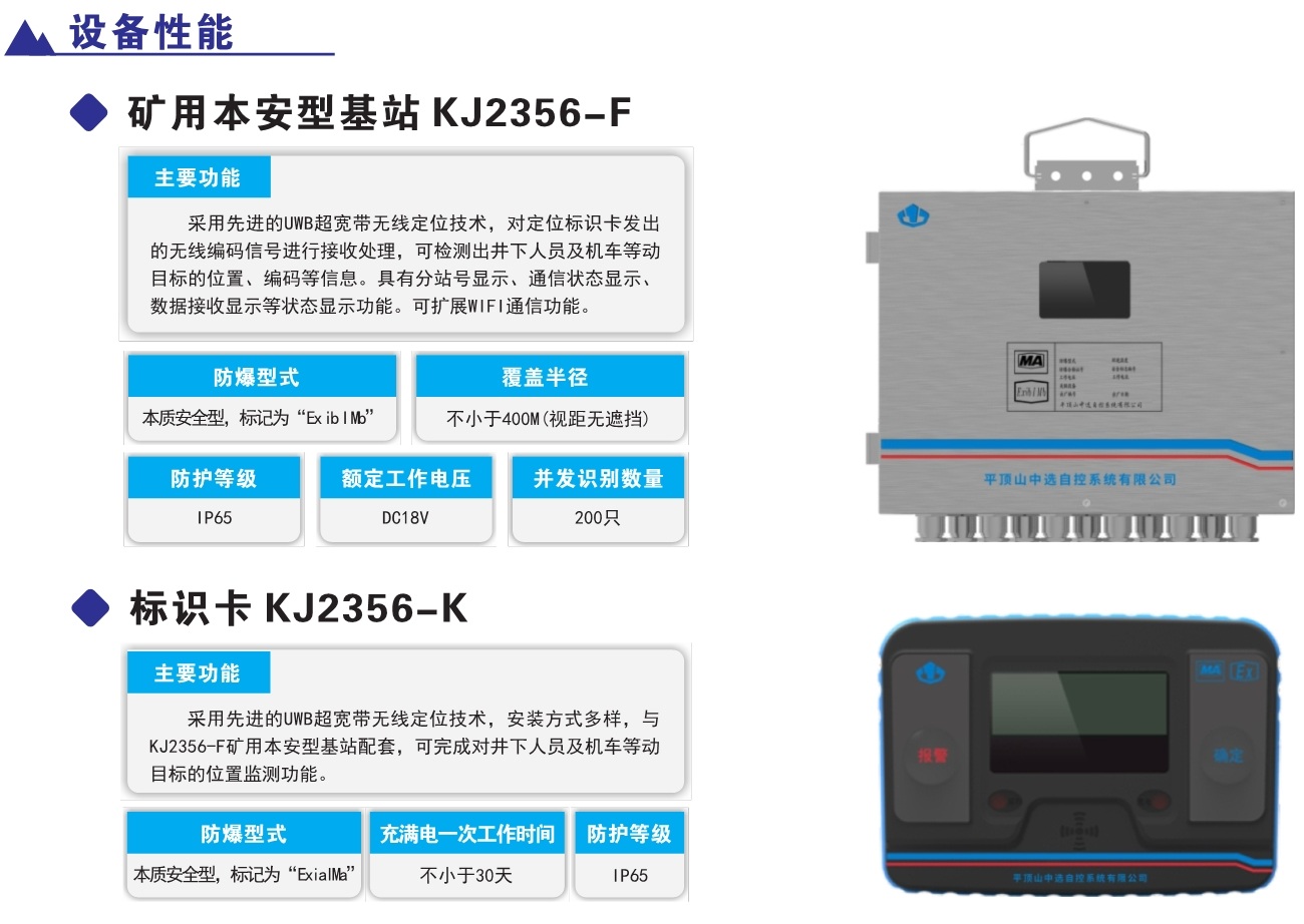 產(chǎn)品簡介:KJ2356J煤礦井下人員精確定位系統(tǒng),采用超寬帶無線(UWB)、慣性測量單元(IMU)、到達(dá)時(shí)差法(TODA)等多源融合定位方法,實(shí)現(xiàn)井下移動(dòng)目標(biāo)定位精度小于0.3米的井下類GPS系統(tǒng)。該系統(tǒng)不僅強(qiáng)化了人員位置的精準(zhǔn)感知,實(shí)現(xiàn)煤礦井下作業(yè)人員位置的監(jiān)測管理、報(bào)警、各類數(shù)據(jù)查詢及報(bào)表功能。同時(shí)支持與車輛定位融合,將精準(zhǔn)定位技術(shù)應(yīng)用到井下機(jī)車、采掘裝備等各類設(shè)備。該系統(tǒng)具有定位精度高、抗干擾能力強(qiáng),系統(tǒng)容量大、安裝使用簡便等特點(diǎn),對煤礦高效生產(chǎn)和應(yīng)急教援具有十分重要的意義。該系統(tǒng)不僅強(qiáng)化了人員位置的精準(zhǔn)感知,實(shí)現(xiàn)煤礦并下作業(yè)人員位置的監(jiān)測管理、報(bào)警、各類數(shù)據(jù)查詢及報(bào)表功能。同時(shí)支持與車輛定位融合,將精準(zhǔn)定位技術(shù)應(yīng)用到井下機(jī)車、采掘裝備等各類設(shè)備。